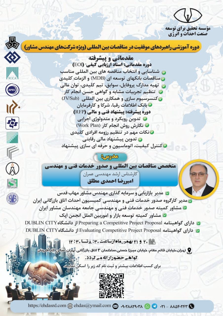 ✅دوره آموزشی حضوری: ▫️ آشنایی با فرمهای توافقنامه با تمرکز بر قراردادهای کارفرما- مهندس مشاور Module 0 - Professional Service Agreement ▫️زمان: 10 تیرماه 1403 ساعت 13/30 تا 17/30 ▫️محل برگزاری : جامعه مهندسان مشاور ایران ▫️ثبت نام: 22406260 ( داخلی 105 ) 6260 ( داخلی 105 )